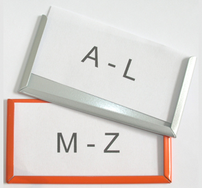 Außenmaß: 100 x 50 mm Sichtfenster: 90 x 47 mm Einlage: 98 x 49 mm Loch-Ø 1,8 mm -alternativ selbstklebend oder magnethaftend- Eisen 0,5 mm, farbig pulverbeschichtet Art.-Nr. lose: 1022